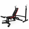 Расстояние между стойками скамьи составляет 63 сантиметра, что позволяет использовать большинство видов штанг. Угол наклона скамьи регулируется, что дает возможность выполнять различные виды жима лежа и другие упражнения.